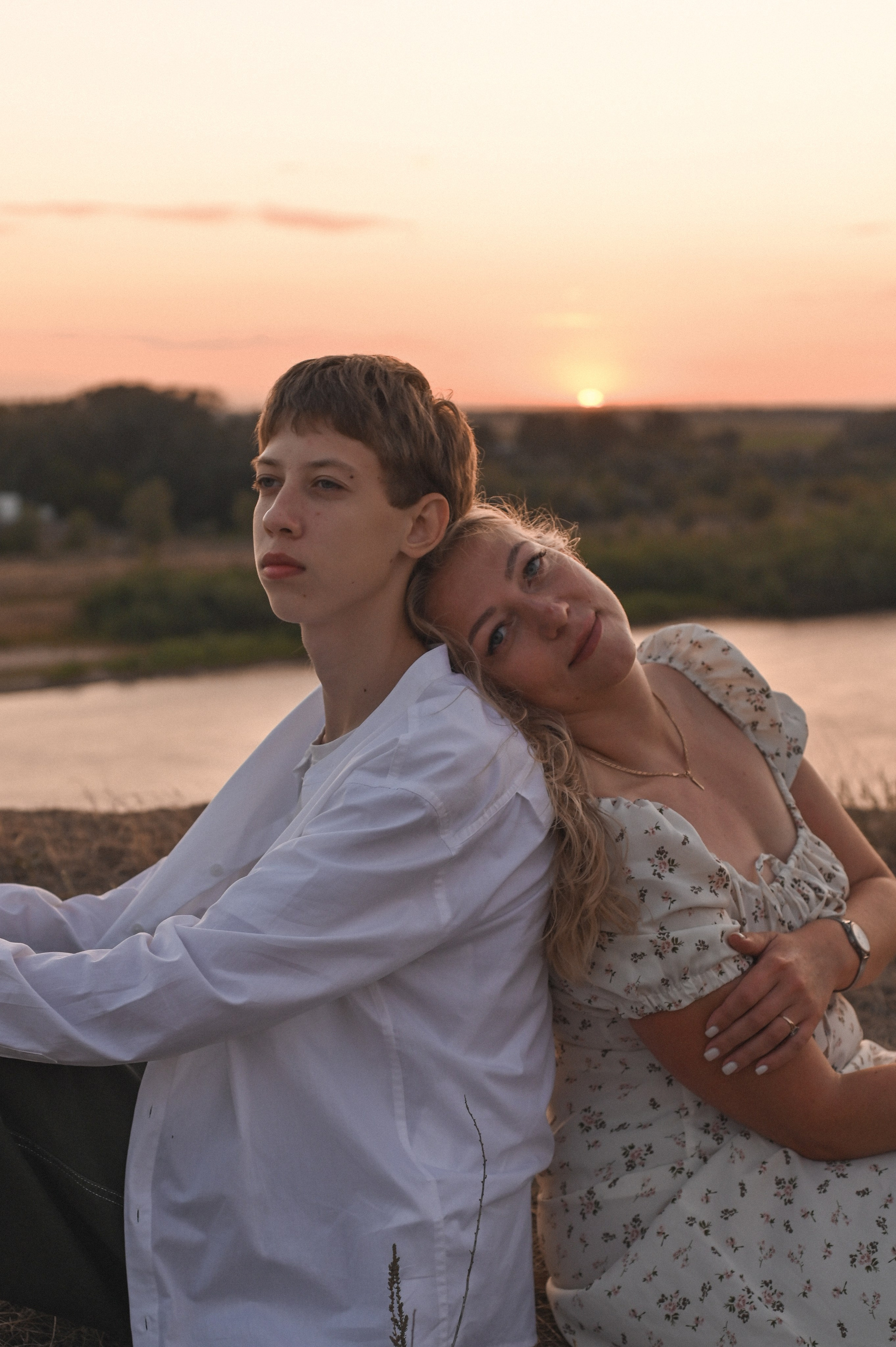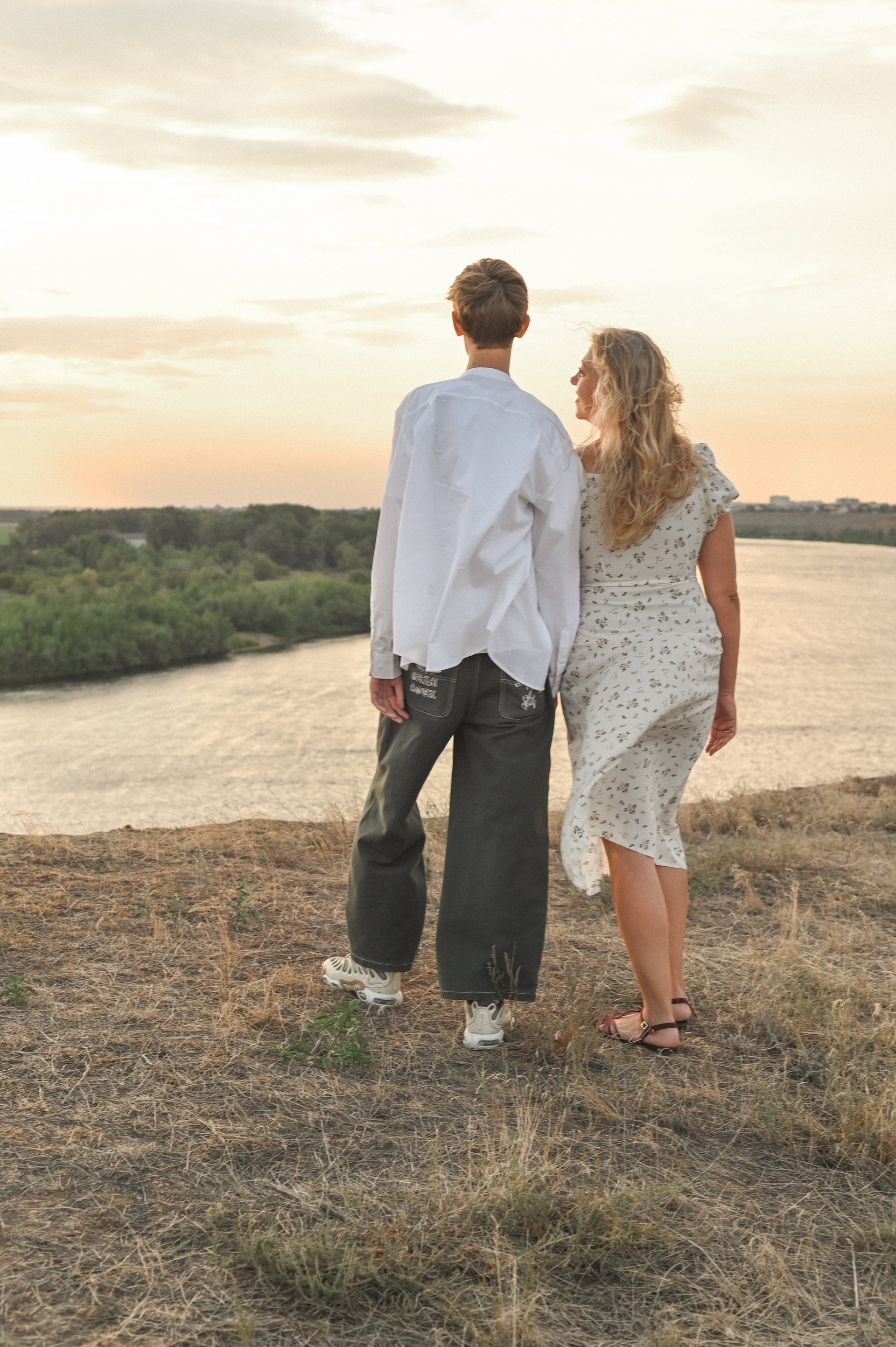 Семейная фотосессия на берегу реки на закате